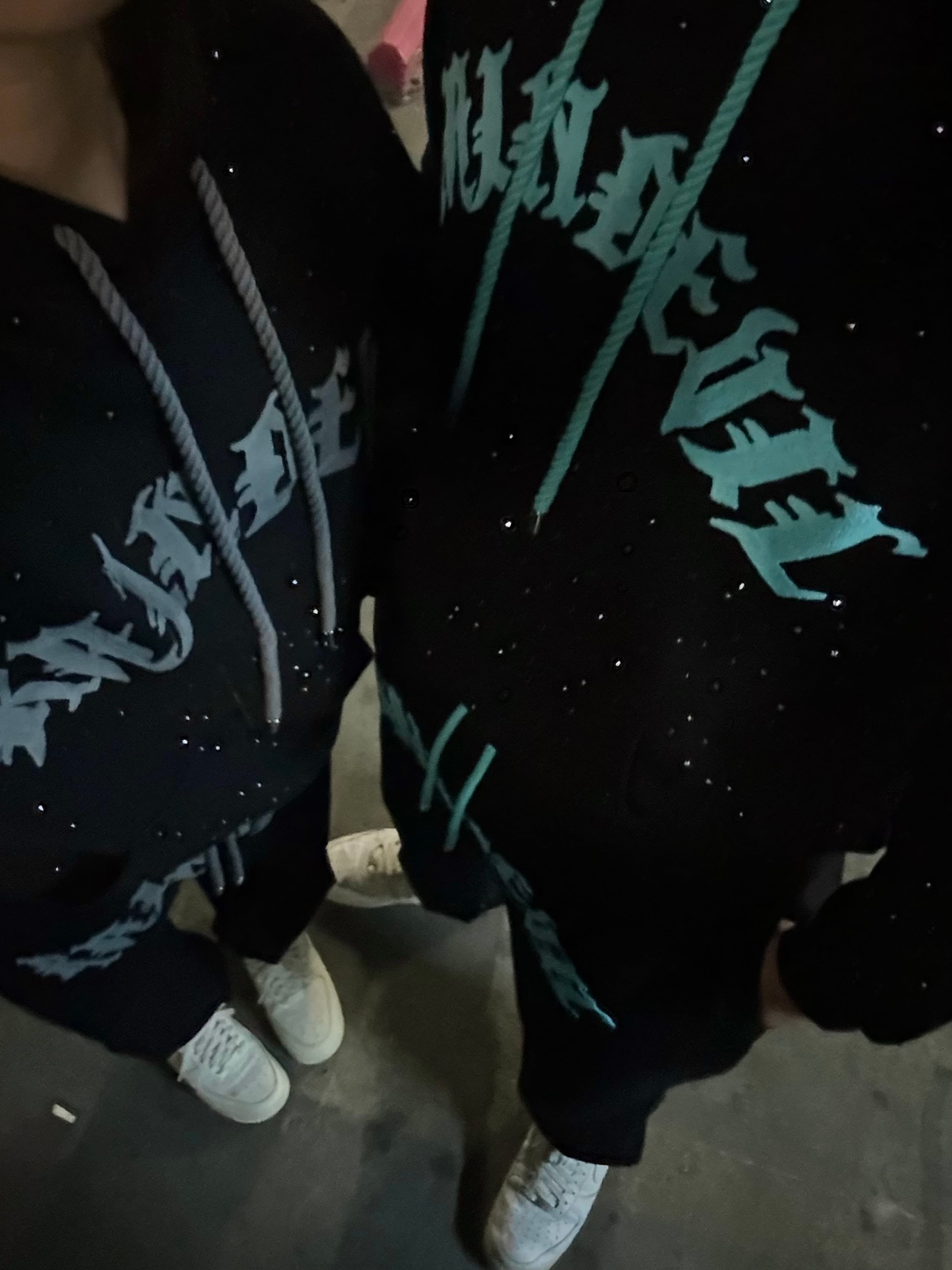 パーカーにはキラキラのラインストーンが敷き詰められており、ズボンは裾部分にラインストーンが散りばめられています。